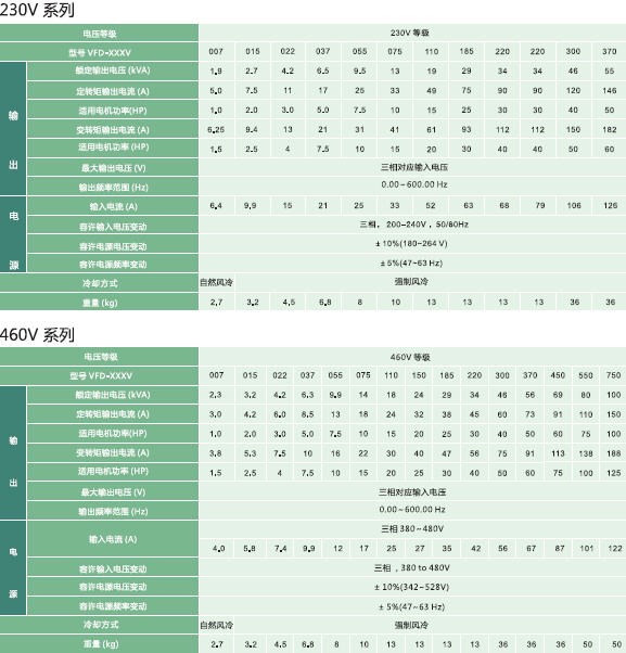 | VFD-007V | 2.3 | 3.0 | 1.0 | 3.8 | 1.5 | 三相對應輸入電壓 | 0.00-600.00Hz | 4.0 | 三相380-480V | 三相,380to 480V | +10%(342-528V) | +5%(47-64 Hz) | 自然冷風 | 2.7 |
