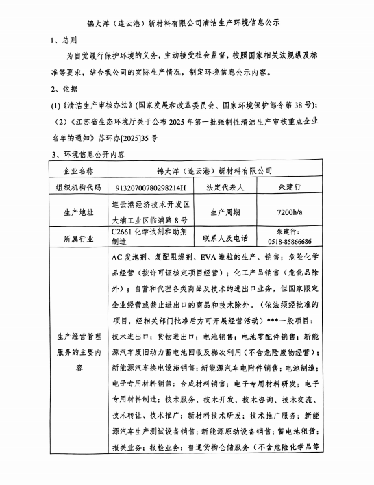 為深入推進連云港市污染物減排工作,根據《江蘇省生態環境廳關于公布2025年第一批強制性清潔生產審核重點企業名單的通知》蘇環辦[2025]35號,公司須實施清潔生產審核。現將公司基本情況公示如下