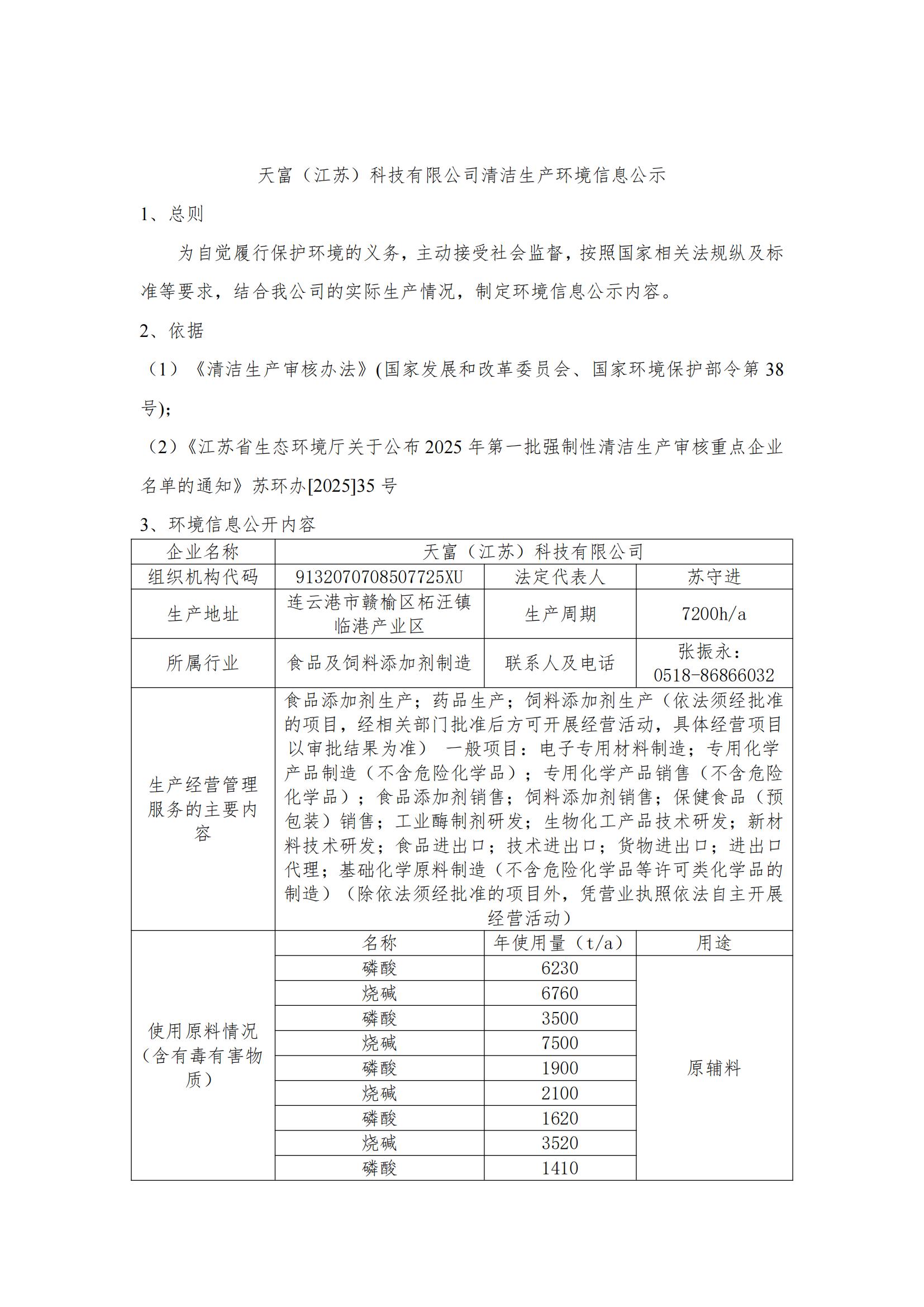 天富(江蘇)科技有限公司清潔生產環境信息公示