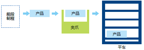 - 由前段將產品輸送至固定位,夾爪將產品夾起放到平車內