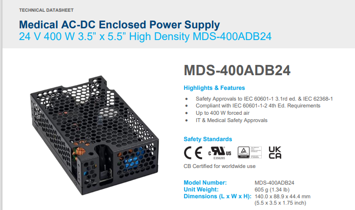 - Safety Approvals to IEC 60601-1 3.1rd ed. & IEC 62368-1