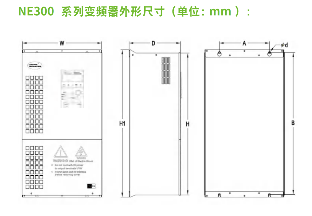| NE300變頻器型號及外形尺寸(單位mm): | ||||||||||