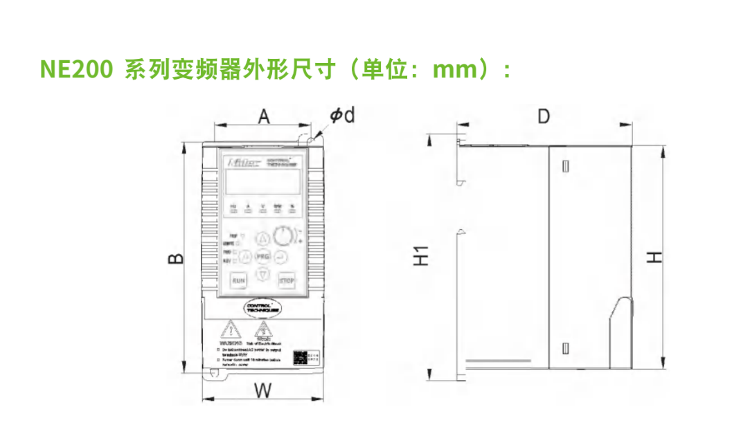 | NE200 系列變頻器型號及外形尺寸表(單位mm): | ||||||||||