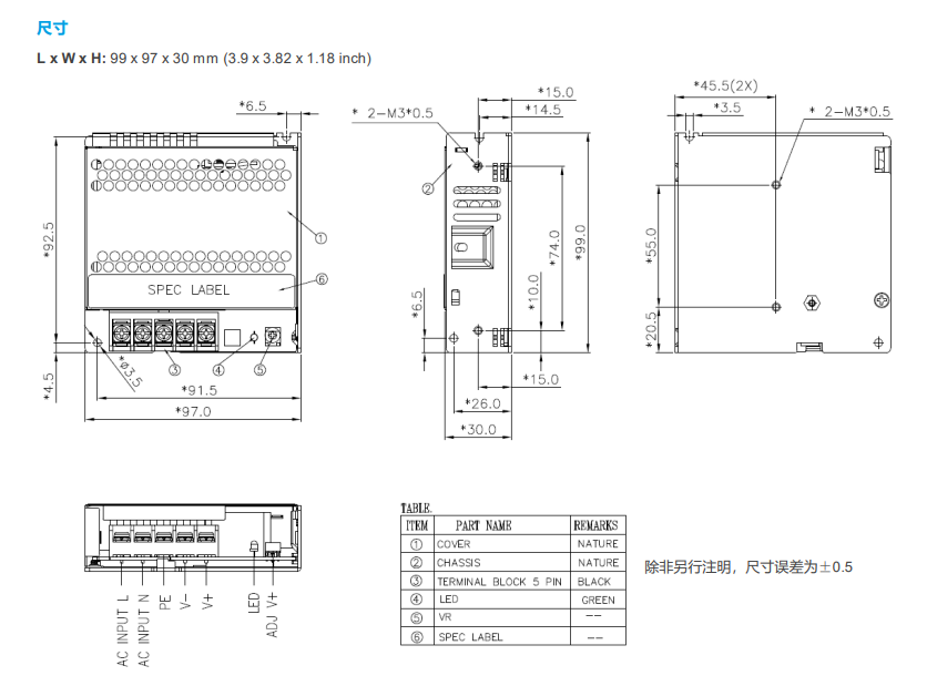 尺寸(L × W × H) mm 99 × 82 × 29 99 × 82 × 29 99 × 97 × 30 129 × 97 × 30 159 × 97 × 30 159 × 97 × 30 159 × 97 × 30 215 × 115 × 30