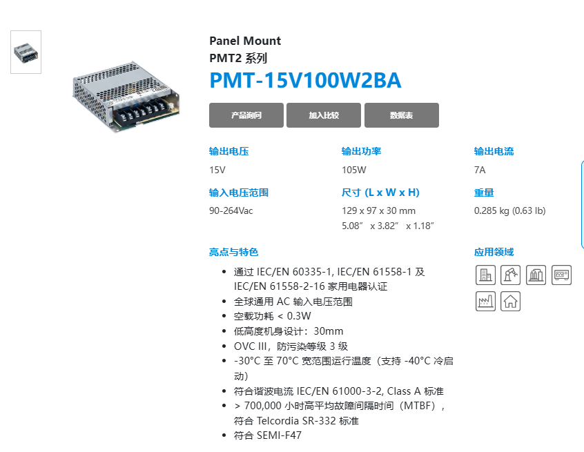 | 輸出 | PMT-15V35W2BA | PMT-15V50W2BA | PMT-15V75W2BA | PMT-15V100W2BA | PMT-15V150W2BA | PMT-15V150W2CA | |