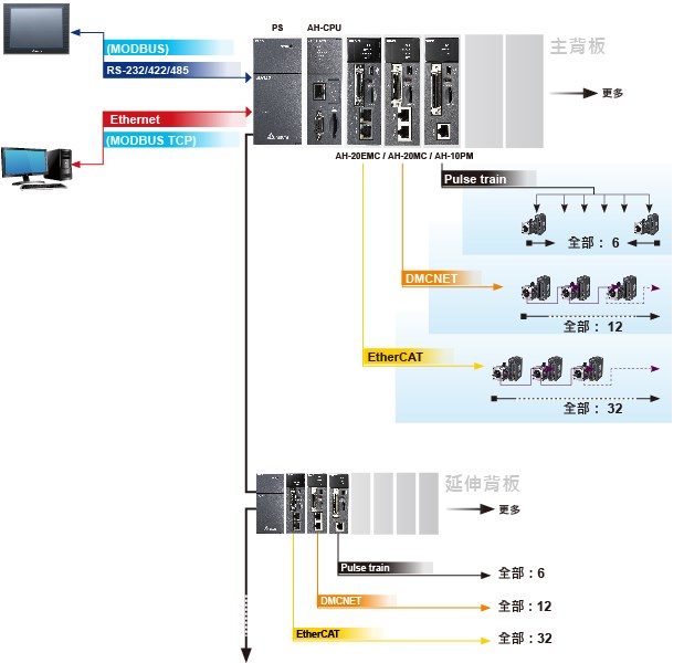- 所有的運動控制模塊都可以安裝在本地端的主背板與延伸背板上